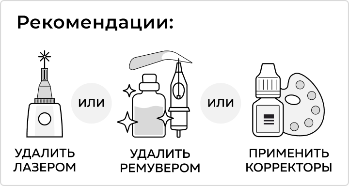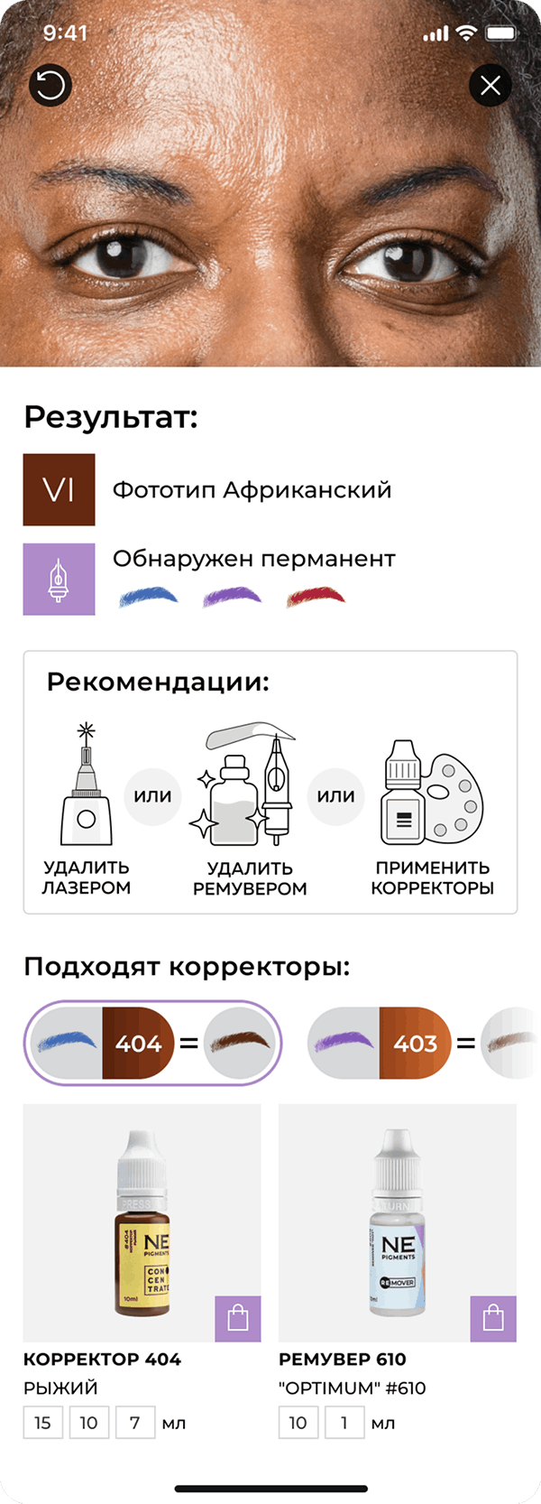 Если его нет — приложение подбирает варианты подходящих пигментов. Если есть — показывает подходящие средства для коррекции или предлагает удалить пигмент лазером.