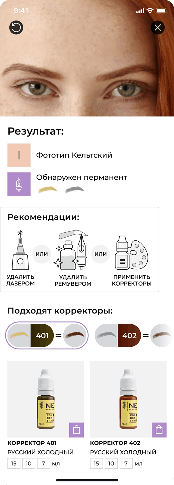 AI-инструмент для подбора подходящих пигментов и корректоров для бровей по фотографии клиента с учётом его фототипа