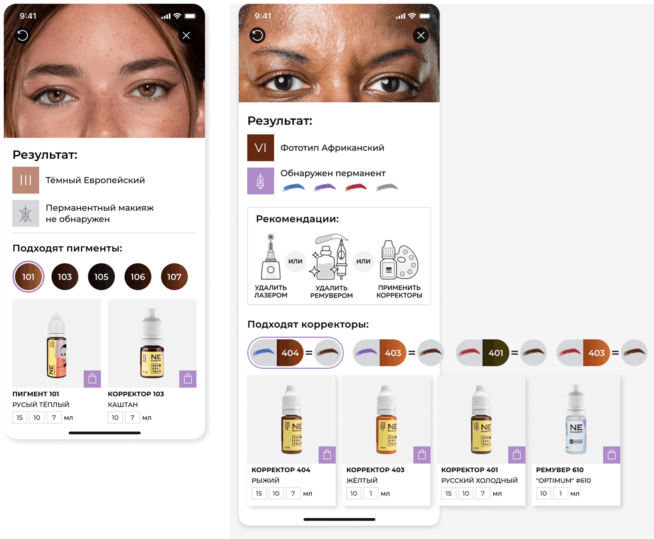 Приложение помогает мастерам подбирать цвет пигмента с учётом фототипа кожи и упрощает работу при нанесении перманентного макияжа. За это отвечают встроенный AI и специальные инструменты «Симметрия» и «Подбор пигментов».