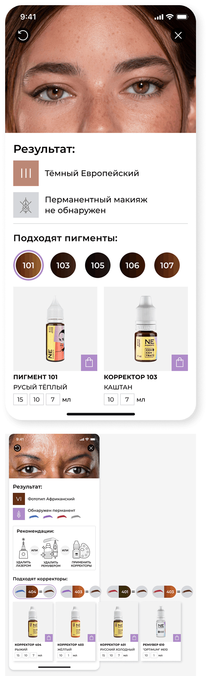 Нейросети подбирали, настраивали и обучали специально под NE pigments. В процессе обучения загрузили более 1600 фотографий лиц, чтобы научить различать фототипы и определять наличие перманента.